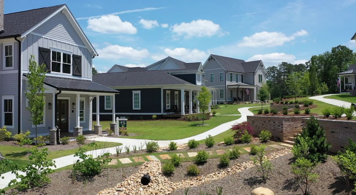 With an abundant amount of greenspace, tranquil parks, a village green, and walking trails, Homestead at Hog Mountain is designed for human connectivity. This 3D rendering of our pocket park highlights how our cottage homes will face inward towards a beautiful green space that is shared by neighbors.
